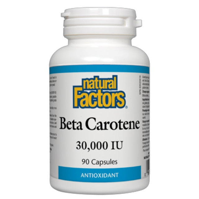 Natural Factors Beta Carotene is a source of vitamin A and a powerful antioxidant that protects the body from free radical damage. This antioxidant is essential for many bodily processes including maintenance of eyesight, skin, membranes and immune function, and for the development and maintenance of bones, teeth, and night vision....Overview.Natural Factors Beta Carotene is a source of vitamin A and a powerful antioxidant that protects the body from free radical damage. This antioxidant is essential for many bodily processes including maintenance of eyesight, skin, membranes and immune function, and for the development and maintenance of bones, teeth, and night vision...Medicinal Ingredients.Each capsule contains: .Beta-carotene 18,000 mcg.(30,000 IU).Non-Medicinal Ingredients.Rice starch, gelatin capsule (gelatin, purified water), vegetable grade magnesium stearate (lubricant)..Suggested Use.Source of vitamin A for the maintenance of good health, to help maintain eyesight, skin, membranes, and immune function, and for the development and maintenance of bones, teeth, and night vision..Advanced Info.Beta carotene is a member of a class of substances by the name of carotenoids, which are naturally occurring pigments found in plants and are responsible for their vibrant colours. It works as a precursor for vitamin A production when dietary intake is insufficient. As a source of vitamin A, beta carotene helps in the maintenance of overall good health, the maintenance of eyesight, skin, membranes and immune function, and for the development and maintenance of bones, teeth, and night vision...Converted to vitamin A in the liver, beta carotene is a fat-soluble pigment that is one of the most active single oxygen free radical deterrents and scavengers. Its powerful antioxidant activity protects cells from the damaging effects of free radicals, such as those from environmental pollution, cigarette smoke, pesticides, etc. An overload of free radicals leads to cell damage and increases the risk of many degenerative diseases...Naturally plant-sourced, Natural Factors Beta Carotene is available in a high dose of 30,000 IU per capsule, taken once daily, for superior antioxidant protection and the maintenance of good health..