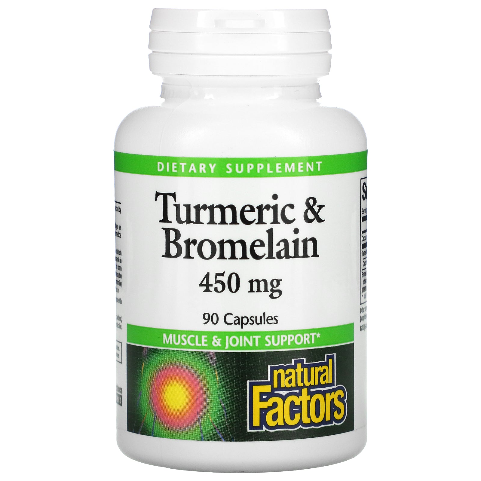 Dietary Supplement.Muscle & Joint Support.Purity & Potency Guaranteed.Turmeric and Bromelain Capsule support digestion naturally while helping to maintain healthy liver function. Turmeric stimulates digestion, supports the liver and has a role in maintaining healthy muscles and joints. Bromelain, an enzyme isolated from the stem of the pineapple plant, aids in digestion by breaking down protein and also enhances the absorption of turmeric. Recent studies also show that bromelain has many health promoting properties. These superior standardized extracts work together, a classic combination...Isura: .Non-GMO: Documentation ?.Mass Spec: Lab Tested ?..Suggested use.1 capsule 1-2 times per day preferably with meals or as directed by a health professional...Other ingredients.Gelatin capsule (gelatin, purified water), magnesium stearate (vegetable grade)...Contains no artificial colors, preservatives, or sweeteners; no dairy, sugar, wheat, gluten, yeast, soy, egg, fish, shellfish, salt, tree nuts, or GMOs...Manufactured by Natural Factors to ensure safety and potency in accordance with Good Manufacturing Practices (GMP) of the FDA and Health Canada..Warnings.As with any supplement, consult your health professional before use if you are pregnant, feeding or trying to conceive, or if you are taking medication, have a medical condition, or anticipate a surgery. Keep out of reach of children...Sealed for your protection. Do not use if seal is broken. For freshness, store in a cool, dry place...Disclaimer.While iHerb strives to ensure the accuracy of its product images and information, some manufacturing changes to packaging and/or ingredients may be pending update on our site. Although items may occasionally ship with alternate packaging, freshness is always guaranteed. We recommend that you read labels, warnings and directions of all products before use and not rely solely on the information provided by iHerb..
