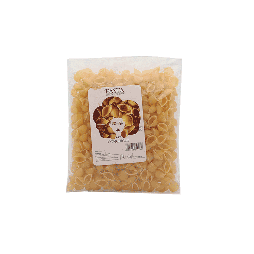 Conchiglie, commonly known as "shells" or "seashells", is a type of pasta. It is usually sold in the plain durum wheat variety, and also in colored varieties which use natural pigments, such as tomato extract, squid ink or spinach extract.