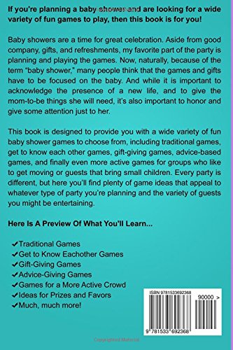 Baby showers are a time for great celebration. Aside from good company, gifts, and refreshments, my favorite part of the party is planning and playing the games. Now, naturally, because of the term “baby shower,” many people think that the games and gifts have to be focused on the baby. And while it is important to acknowledge the presence of a new life, and to give the mom-to-be things she will need, it’s also important to honor and give some attention just to her. This book is designed to provide you with a wide variety of fun baby shower games to choose from, including traditional games, get to know each other games, gift-giving games, advice-based games, and finally even more active games for groups who like to get moving or guests that bring small children. Every party is different, but here you’ll find plenty of game ideas that appeal to whatever type of party you’re planning and the variety of guests you might be entertaining. |