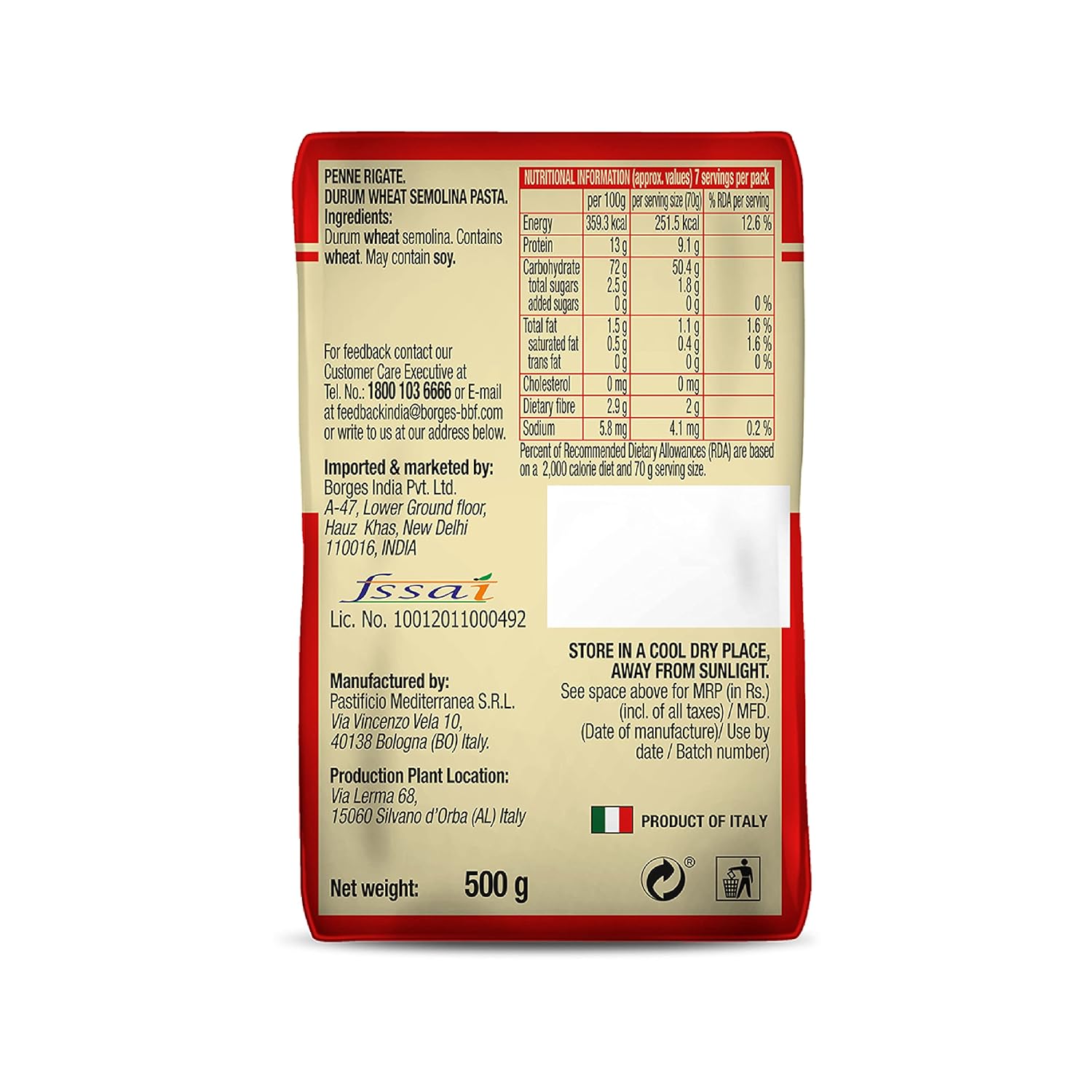 500g Package: The 500g packaging size is convenient for households and small gatherings, providing enough pasta for several servings.