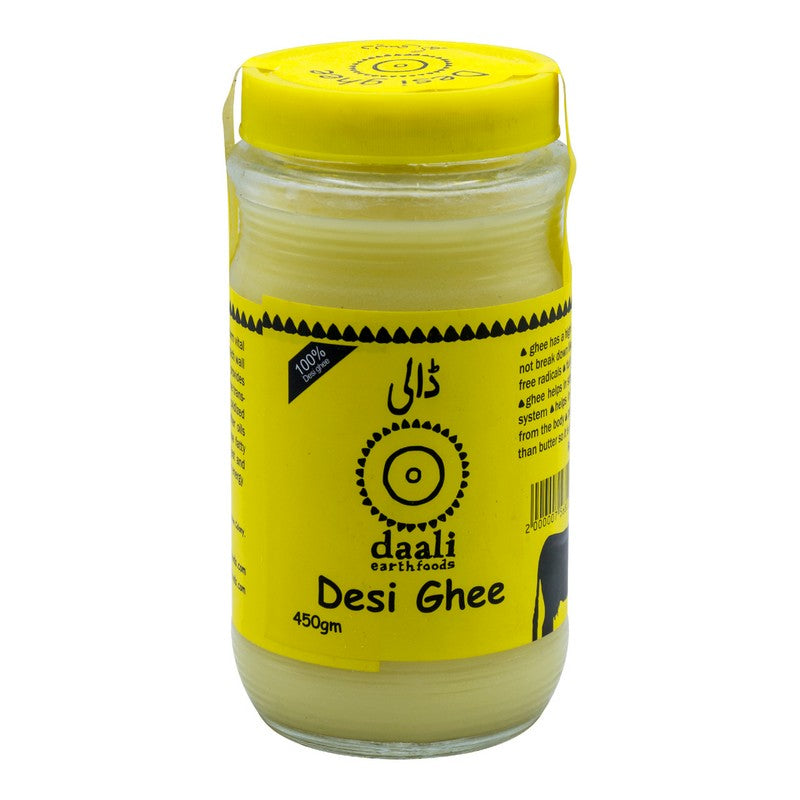Daali Desi Ghee is a traditional and popular dairy product known for its rich flavor and various culinary applications. It is a type of clarified butter that has been used in Indiancuisine and many other cuisines around the world for centuries. The 450-gram packaging size is convenient for households and cooking enthusiasts. Taste: Daali Desi Gheehas a distinctively rich and nutty flavor. It offers a delightful combination of buttery sweetness and a slightly caramelized aroma. Texture: At room temperature, it is typicallysolid but has a smooth and creamy texture. When heated, it transforms into a clear liquid. Ingredients: Milk Fat: Daali Desi Ghee is made from pure milk fat, which is separated from butter. It does not contain any artificial additives orpreservatives.Authenticity:Authentic desi ghee is prepared by simmering butter over a low flame until the water content evaporates, and the milk solids caramelize. Daali Desi Ghee follows this traditional method to ensure authenticity.Purity: Good quality desi ghee is known for its purity, and Daali is expected to maintain high purity standards.Source: It is important to source ghee from trusted dairy sources to ensure the quality and taste.