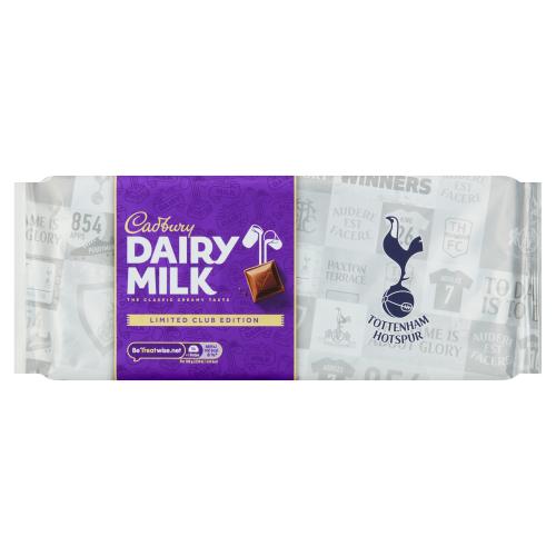 Dairy Milk Tottenham Hotspur is a 360g chocolate bar featuring the beloved Cadbury Dairy Milk chocolate with special Tottenham Hotspur branding, perfect for fans of the team.