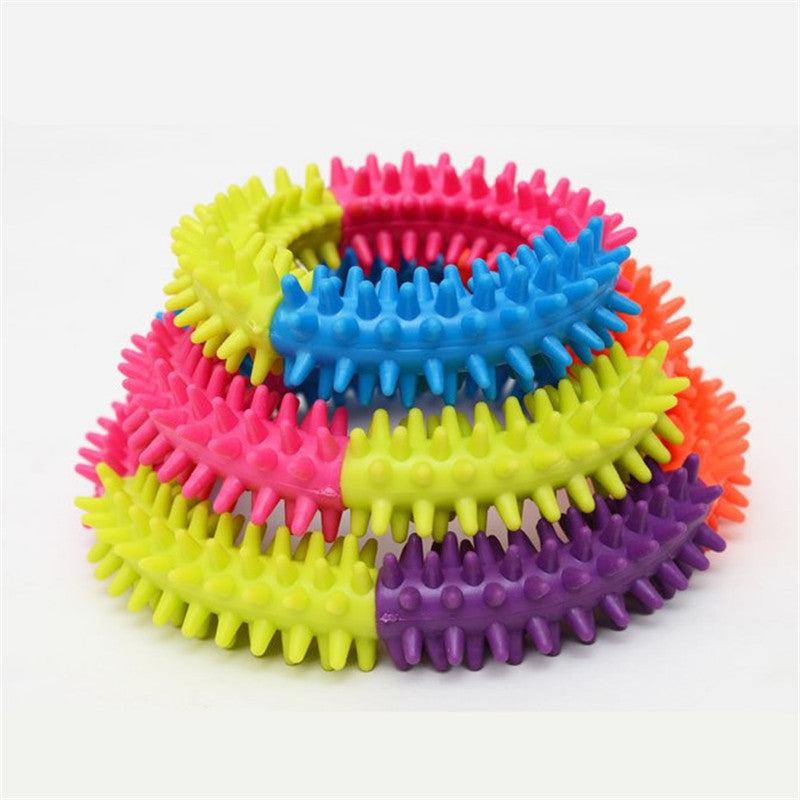 CUTE DESIGN: Sawtooth anti-skid style, colorful ring toys. This dog Interactive toy features spikes, A perfect toy for your pets to have fun DENTAL CARE: Spiked dental nubs effectively clean your pet’s teeth, promotes molar and glister health. This chew toys is veterinarian approved. SAFETY MATERIALS: Absolutely safe materials: Non-toxic Natural Rubber is soft and durable. Bite resistant and flexible.