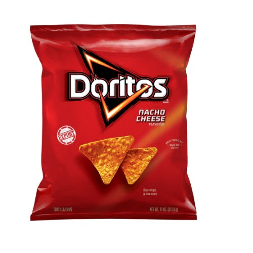 Doritos Chips Nacho Cheese 11oz.311.8g: This larger package of Doritos Chips in the Nacho Cheese flavor contains 11oz (311.8g) of crispy and cheesy chips.