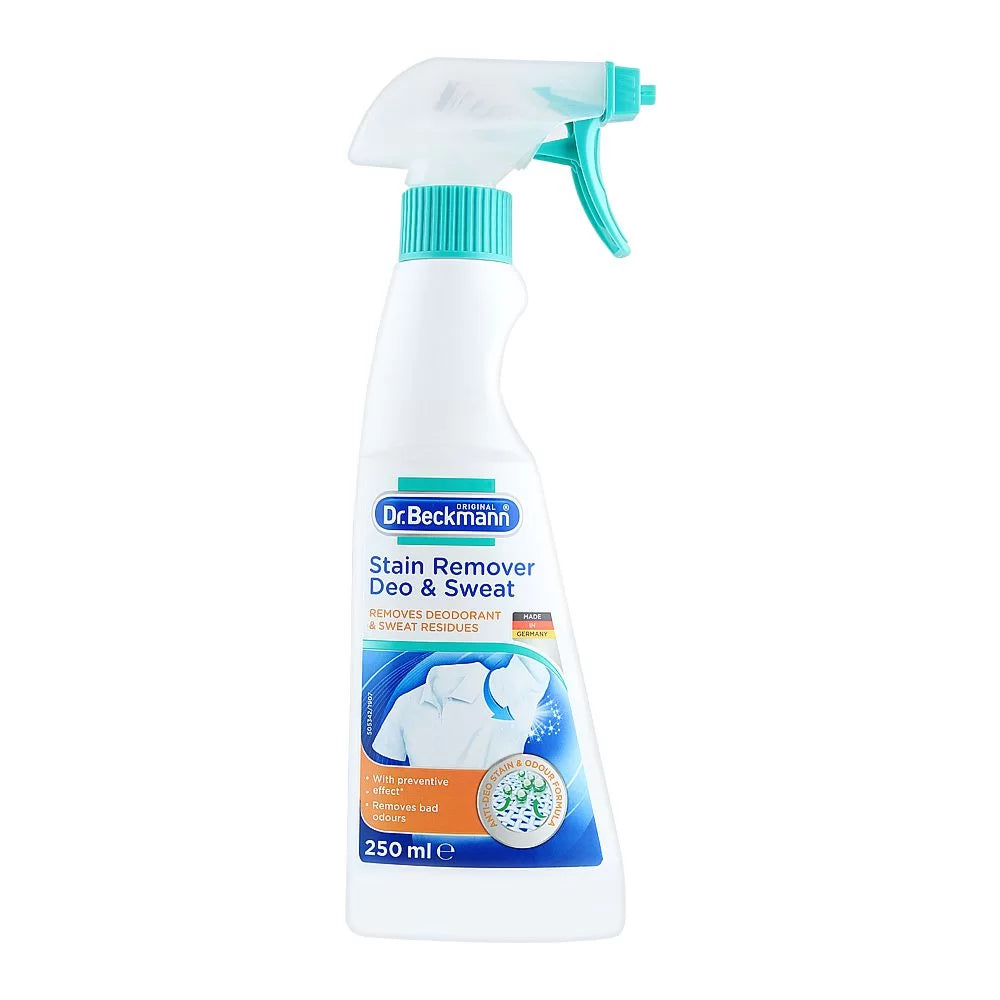 Over the time residues of deodorants and sweat produce persistent and incrusted stains. Additionally a smell of perspiration is not only locked in the stain but also in the fibres. Both cannot be sufficiently removed with general products during the washing cycle. Washing detergents or general stain removers generally do not contain/ or don’t contain enough of the required active ingredient for such a stains. Thus stains and the smell of perspiration are getting more intensive with each wearing. The specific and tailor-made anti-deodorant & anti-odour complex eliminates all residues effectively. The formula is gentle to colours and fibres and thus can be used on white & coloured textiles. Used before each washing Dr. Beckmann Stain Spray Deo & Sweat prevents building up of new residues and odours.