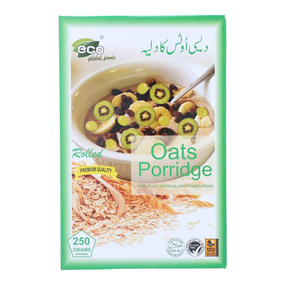Eco Food Rolled Oats Porridge 250g Nutrient-Rich: Rolled oats are a nutritious source of dietary fiber, particularly beta-glucans, which are known for their potential heart-healthy benefits. They also provide essential vitamins and minerals, including manganese, phosphorus, and B vitamins. Versatile Usage: Rolled oats can be used in various dishes and recipes, making them a versatile ingredient. Besides oatmeal, they are often used in baking (cookies, muffins, bread), smoothies, granola, and as a binding agent in meatballs or veggie burgers. Quick and Easy Preparation: Rolled oats are known for their quick cooking time, making them a convenient breakfast option. Preparing oatmeal or porridge is as simple as adding hot water or milk and letting it sit for a few minutes. Satiety: Oatmeal made from rolled oats is known for its ability to keep you feeling full and satisfied due to its high fiber content. It's a popular choice for a healthy and filling breakfast. Health Benefits: Oats are associated with several health benefits, including potential cholesterol-lowering effects, improved blood sugar control, and digestive health due to their fiber content. Eco-Friendly Brand: The "Eco Food" branding suggests a commitment to environmentally friendly and sustainable practices, which may appeal to eco-conscious consumers. Eco Food Rolled Oats Porridge, a premium quality breakfast option that comes in a convenient 250g package. Made from carefully selected rolled oats, this porridge is a healthy and nutritious way to start your day. It is rich in fiber, protein, and essential vitamins and minerals, making it an ideal choice for those who prioritize their health and wellbeing. The Eco Food Rolled Oats Porridge is easy to prepare and can be customized to suit your taste preferences. Enjoy a delicious and wholesome breakfast with this exceptional product from Eco Food.