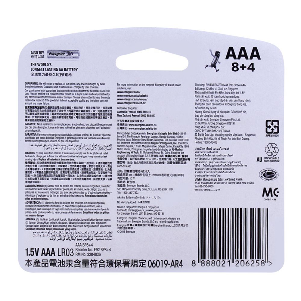 The Energizer Max AAA Batteries are a popular choice for powering a wide range of devices, from remote controls to flashlights and more. The 8+4 pack is a convenient option for those who need a larger quantity of batteries on hand. This pack includes eight standard AAA batteries, as well as an additional four batteries for a total of 12. The extra batteries can come in handy for those who use a lot of power-hungry devices or for those who want to have a backup supply on hand. The Energizer Max AAA Batteries are known for their long-lasting power and reliable performance, making them a trusted choice for many consumers.
