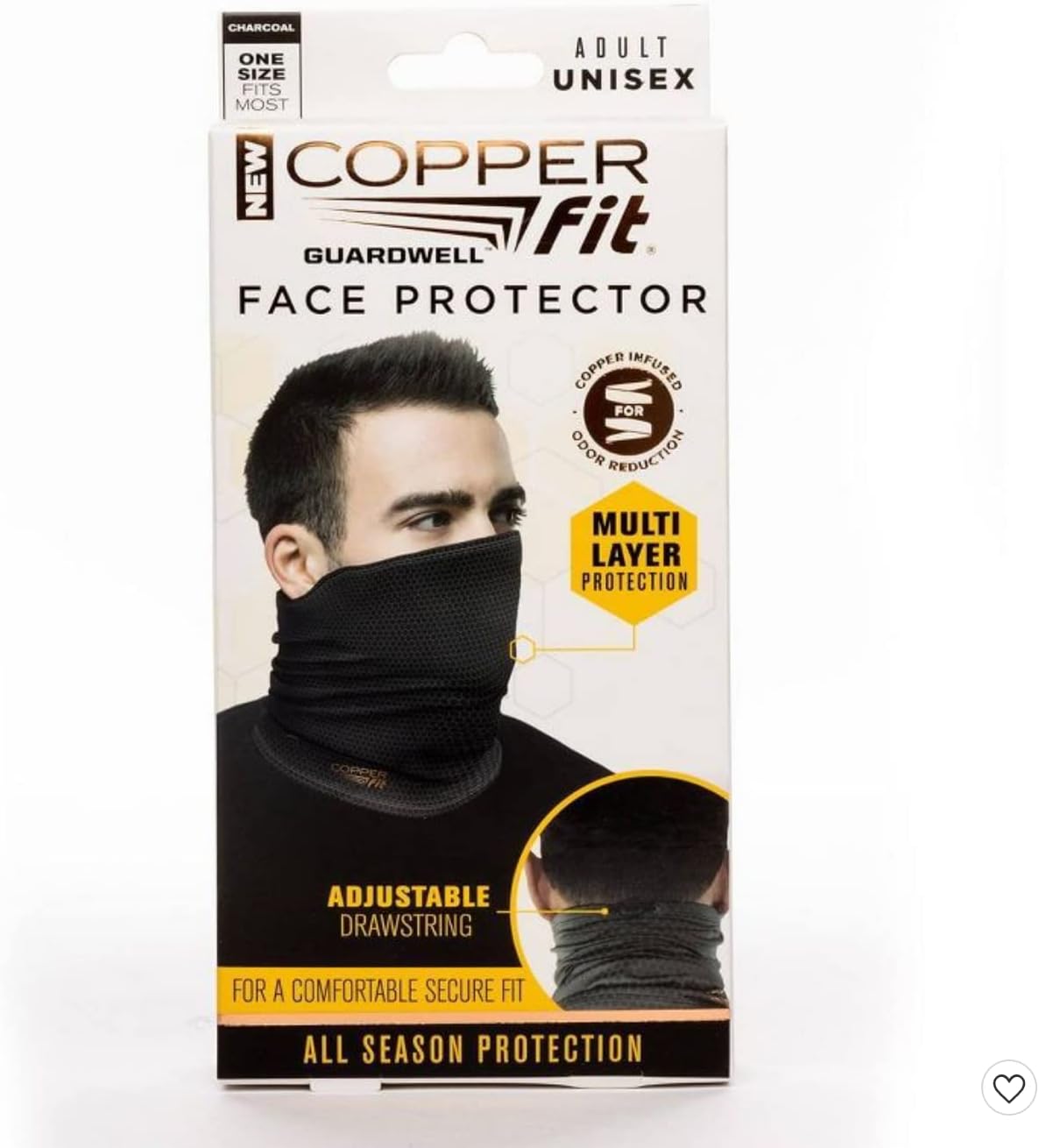 Protect your face with this Guard Well Face Protector from Copper Fit. This lightweight mask is made from stretchable and breathable fabric and offers a comfortable, secure fit. Great for wearing for protection from the sun. Also does not fog up glasses.