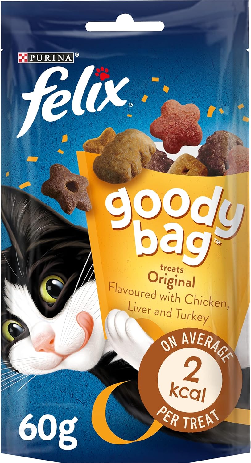 Felix Goody Bag Original Mix 60Gm (8 S): Treat Your Feline Friend with an Irresistible Delight Indulge your fur baby with the Felix Goody Bag Original Mix, a delightful assortment of mouthwatering flavors. Each pack contains 60 grams of delectable treats famous among happy cats everywhere. With this 8-serving pack, you'll have plenty of opportunities to reward your feline companion for their good behavior or simply to shower them with love. Crafted with care, the Felix Goody Bag Original Mix comprises a combination of tender strips, flavorsome meats, and appetizing aromas. Bursting with chicken, ham, and beef, these treats are sure to tantalize your cat's taste buds and keep them purrfection-obsessed! Not only are these treats irresistibly tasty, but they are also packed with essential nutrients to support your cat's overall well-being. Enriched with vitamins and minerals, the Felix Goody Bag Original Mix ensures your feline receives a balanced diet, providing them with the energy they need for their playful adventures. With its resealable packaging, these bite-sized goodies retain their freshness and stay tempting for longer. Treat your feline companion to the Felix Goody Bag Original Mix, a delightful snack to reward their presence in your life.