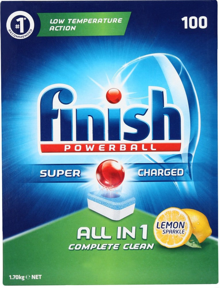 Finish 100 Powerball Super Charged All In One Dishwasher tablets are an all-in-one solution for your dishwasher cleaning needs. Each tablet contains a combination of detergent, rinse aid, and salt, providing a comprehensive cleaning solution for your dishes, glassware, and silverware.