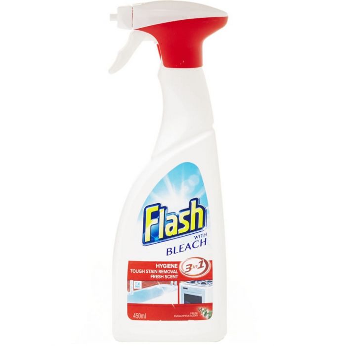 Flash Trigger Bleach Hygiene Tough Stain Removal Fresh 450ml is a cleaning product designed to provide effective stain removal and hygiene in various areas of your home. Flash is a well-known brand that offers a range of cleaning solutions. Flash Trigger Bleach Hygiene contains bleach as one of its primary active ingredients. Bleach is a powerful disinfectant and stain remover that can help eliminate tough stains and disinfect surfaces.