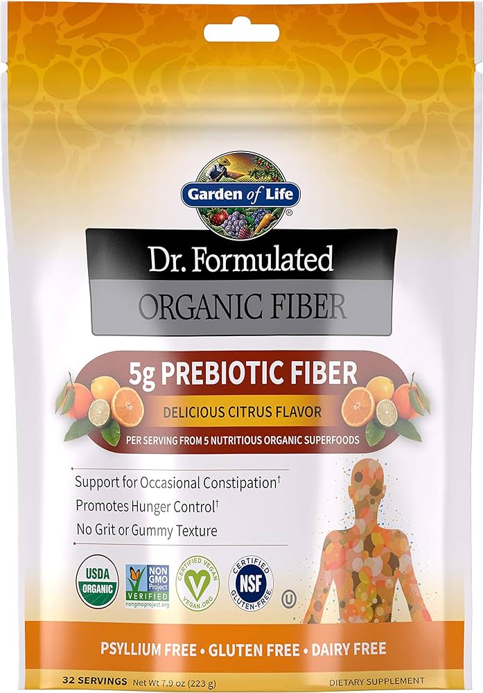 Garden of Life Dr. Formulated Organic 5g Fiber Prebiotic is a dietary supplement providing 5g of fiber and prebiotics to support digestive health.