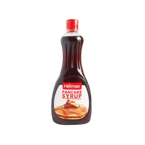 Herman Pancake Syrup 709ml pancake is a flat cake, often thin and round, prepared from a starch-based batter that may contain eggs, milk and butter and cooked on a hot surface such as a griddle or frying pan, often frying with oil or butter.