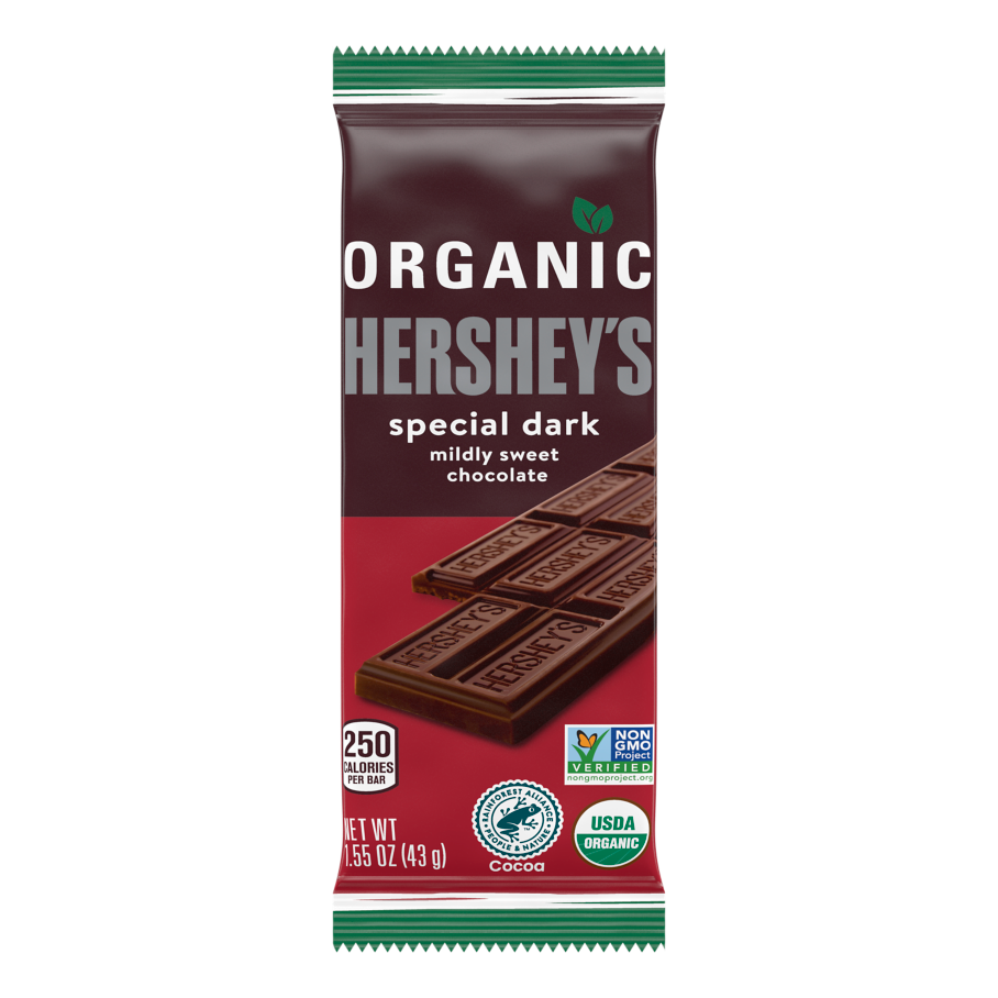 Hershey's Organic Dark Chocolate Bar is a 1.55 oz bar made with rich, organic dark chocolate. It's perfect for those who enjoy the deep, complex flavors of dark chocolate.
