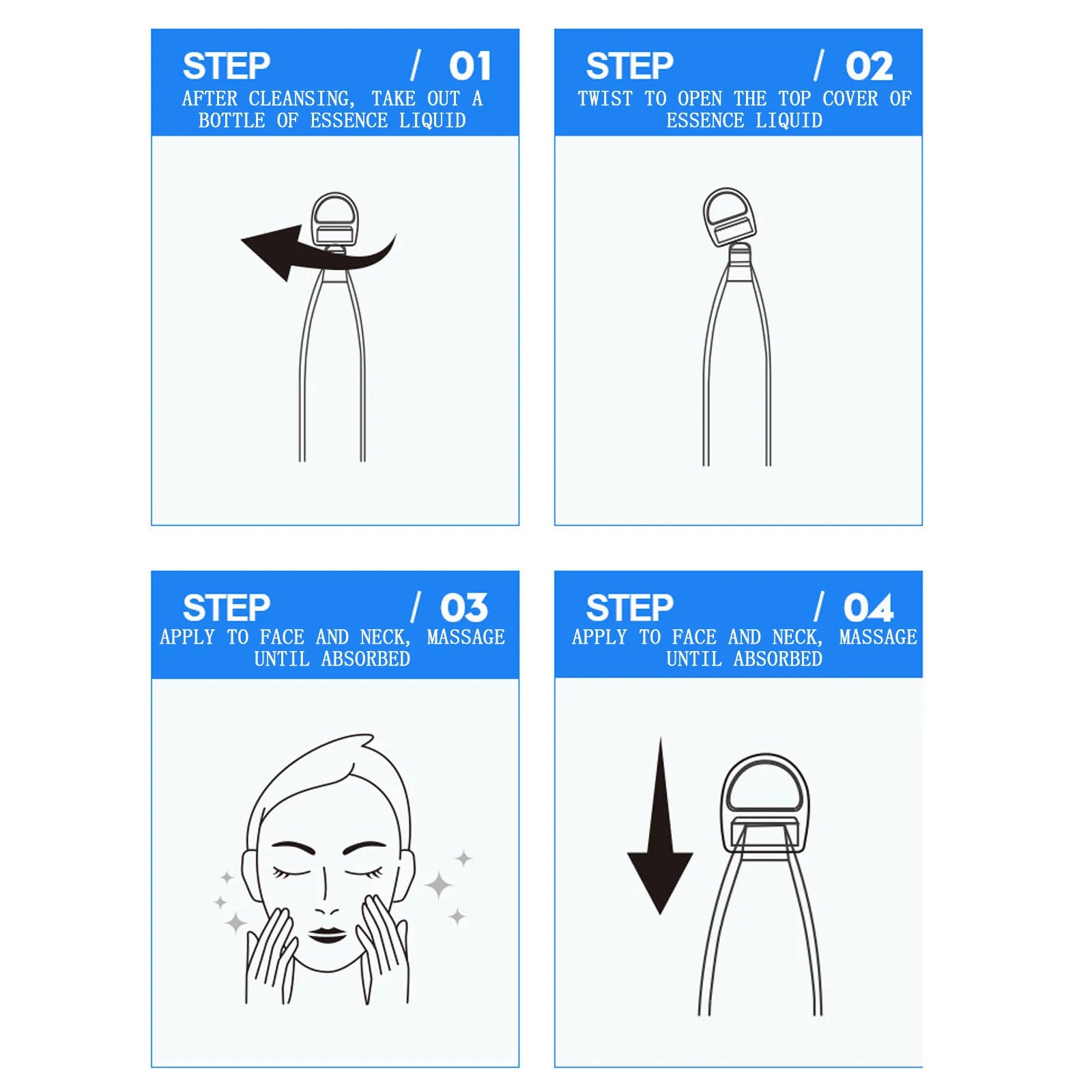 • 4.Correct use method, skin care, correct use steps, and the skin is moisturized, After cleansing, take out a bottle of essence liquid Twist to open the top cover of essence liquid Apply to face and neck, massage until absorbed, Not used up. Please use up the cover within 24 hours