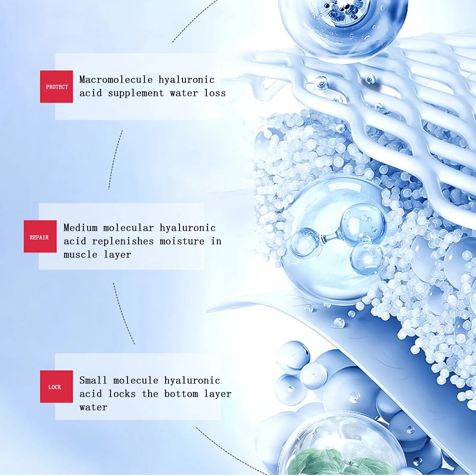 • 3.Core ingredient 8D hyaluronic acid real luxury ingredient, concentrated every gram, Macromolecule hyaluronic acid supplement water loss, Medium molecular hyaluronic acid replenishes moisture in muscle layer, Small molecule hyaluronic acid locks the bottom layer water