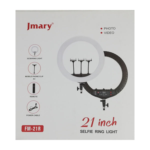 - The key feature of the Jmary 21 Inch Selfie Ring Light is its circular or ring-shaped design. This design evenly distributes light, reducing harsh shadows and providing a flattering and even illumination for subjects.