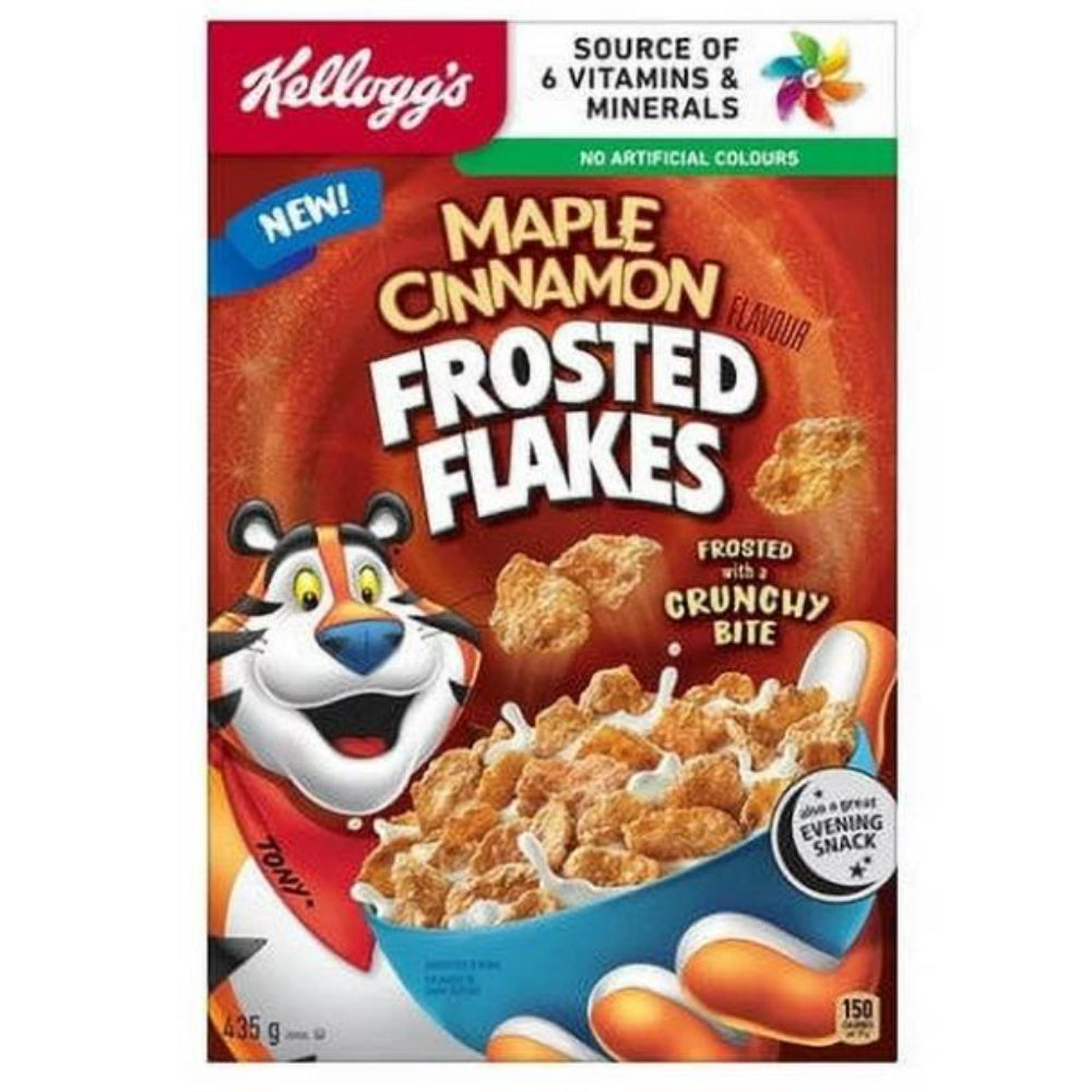 Maple cinnamon Frosted Flakes Cereal, 435g/15 oz. Box. A new twist on the old classic The perfect combination of maple syrup flavor and warm cinnamon spice on golden toasted corn flakes. crunchy whole grain flakes with warm cinnamon and maple flavor