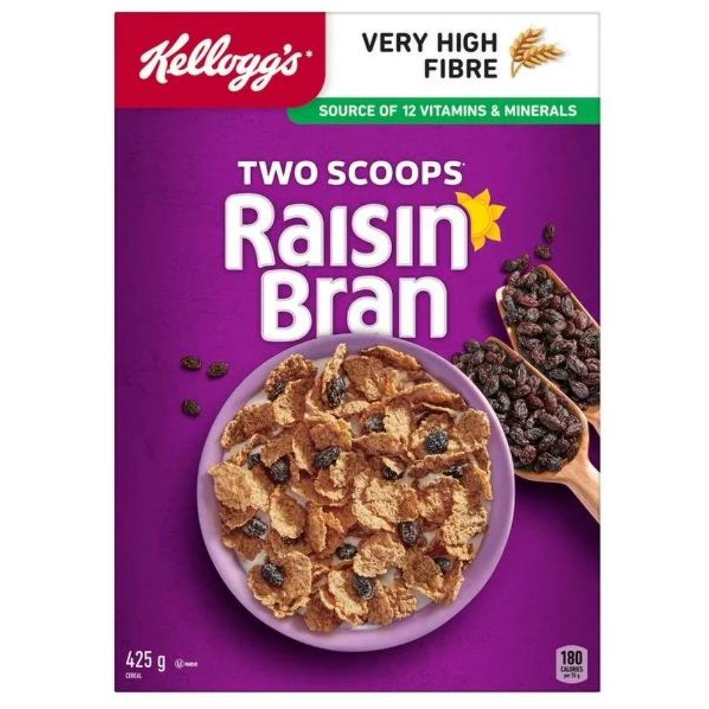 Two Scoops Raisin Bran cereal is a delicious combination of crispy bran flakes & sweet sun-ripened raisins. Each serving is a source of 11 essential nutrients, has no artificial flavours or colours and is a very high source of fibre. Two Scoops Raisin Bran is a great way to start to your day as part of a nutritious breakfast