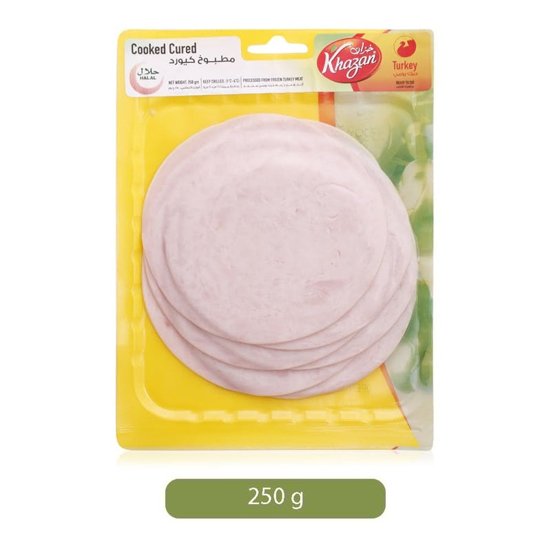 Khazan Cured Turkey Sliced is extra lean, extra flavorful. Our classic smoked turkey is made from 100% halal pure turkey meat, smoked with the finest European forests wood. Perfect for light snacks.