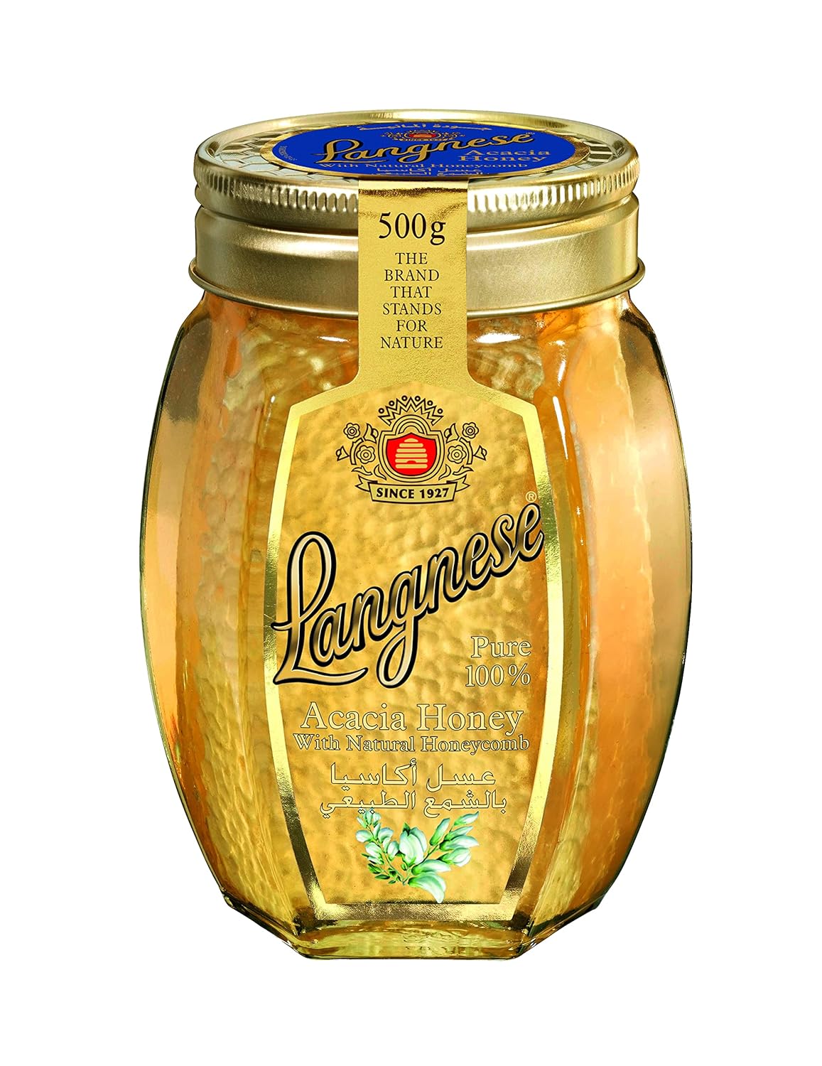 Langnese Honeycomb Honey 500g: Langnese Honeycomb Honey in a 500g jar is a unique offering with pieces of honeycomb immersed in pure honey. It provides a delightful combination of flavors and textures for your culinary adventures.