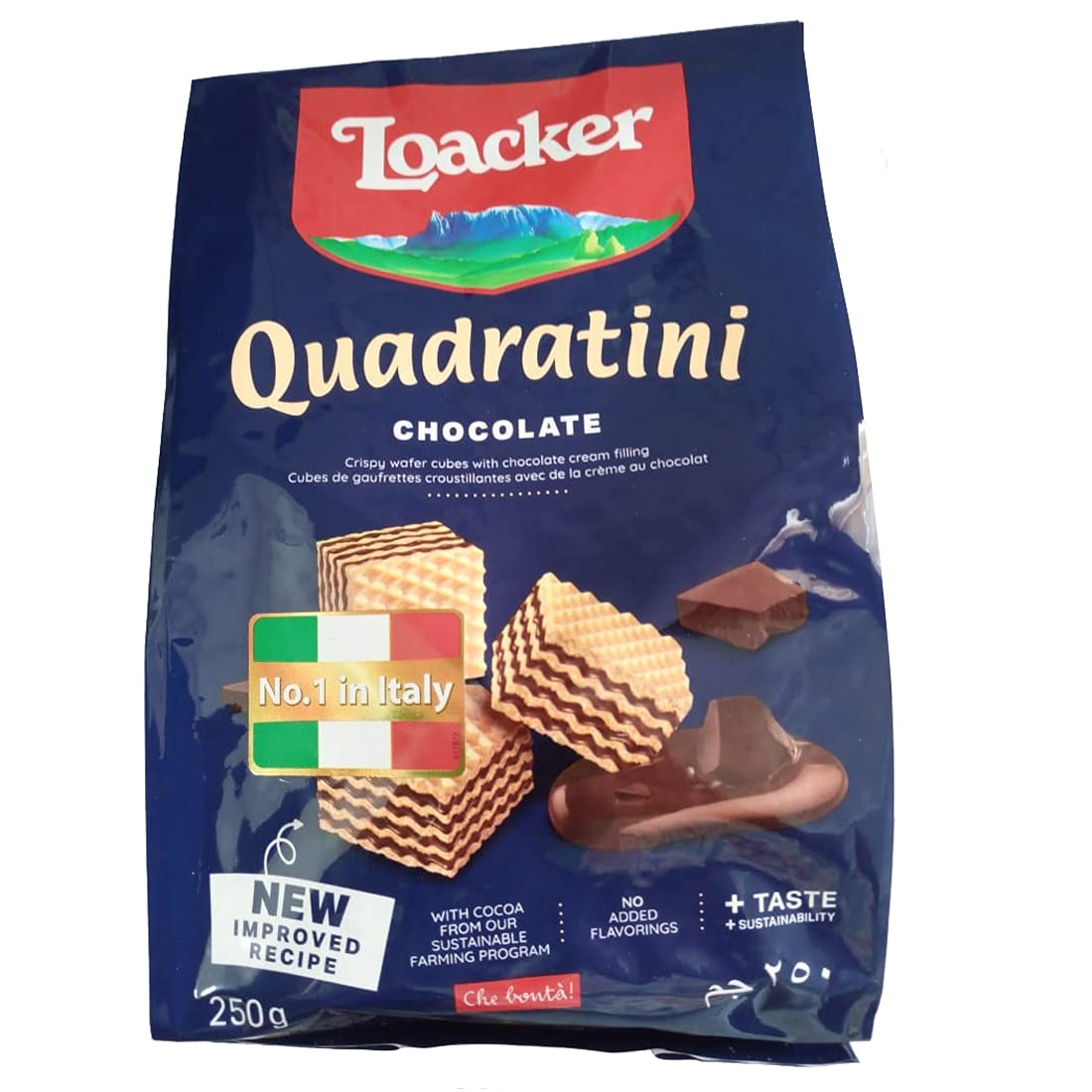 Loacker Wafer Quadratini Chocolate 250g: Loacker Wafer Quadratini in Chocolate flavor offers bite-sized wafers with a creamy chocolate filling. This 250g bag is perfect for sharing or snacking on the go.