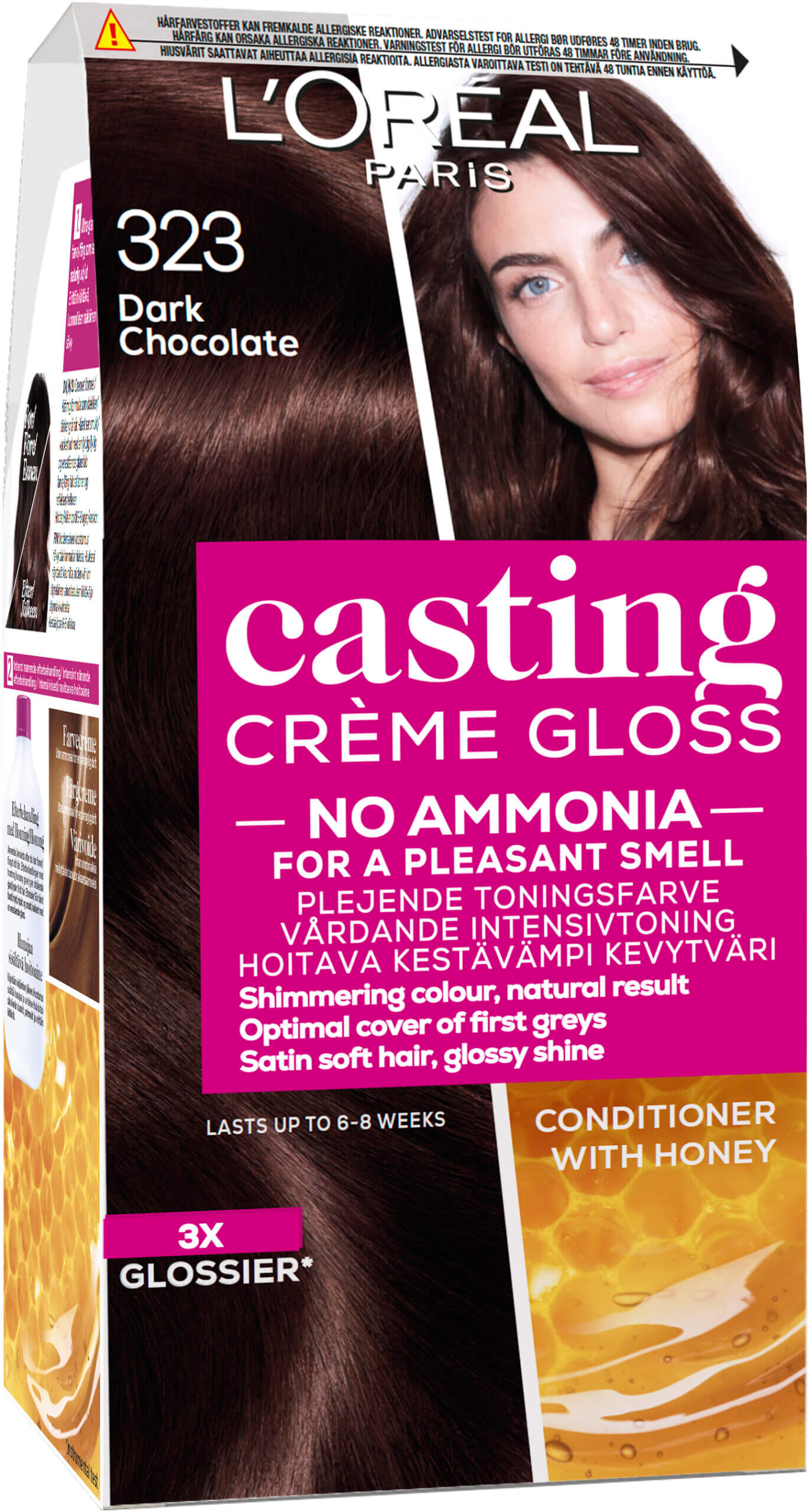 L'Oréal Casting Hair Color Dark Chocolate 323 is a hair coloring product designed to provide a luscious and deep chocolate brown shade to your hair. L'Oréal Casting Hair Color in Dark Chocolate (Shade 323) is formulated to deliver a rich and indulgent chocolate brown color to your hair. It's perfect for individuals who desire a deep and decadent brown shade.