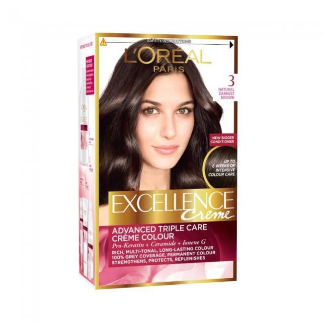 Offers 85% less breakage from brushing - Pro-keratin, ceramide, collagen - Permanent hair dye with up to 100% grey coverage - Rich long-lasting color, silky touch - Strengthens, protects and replenishes the hair Keep dull hair at bay with L'Oral Paris Excellence Crme. Over time, your hair loses vitality and your colour loses radiance, which is why we developed our first non-drop conditioning formula in the advanced triple protection excellence formula enriched with Pro Keratin, to help replenish hair and rejuvenate colour, Ceramide,to prtect the hair fibre and Collagen, which nourishes the hair and makes it look fuller and stronger. Hair feels healthy, silky and soft, whilst colour looks sensational - and not a grey in sight.