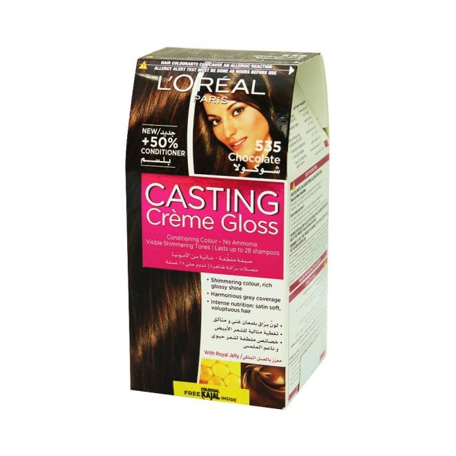 Ammonia free hair color cream - Cover grey hair - Visible shiny reflects for up to 28 shampoos - Reusable Bath of Brilliance conditioner with Royal Jelly (60ml) - 4x more glossy hair First grey hair Don't panic Succumb to Casting's irresistible ultra brilliant and visible reflects. Blends away first grey hair for a natural-looking color that lasts up to 28 shampoos. 4 times more glossy hair thanks to its new reusable bath of brilliance conditioner enriched with Royal Jelly (60ml). Intense nutrition for satin-soft voluptuous easy to detangle hair : the perfect match for long to very long hair.