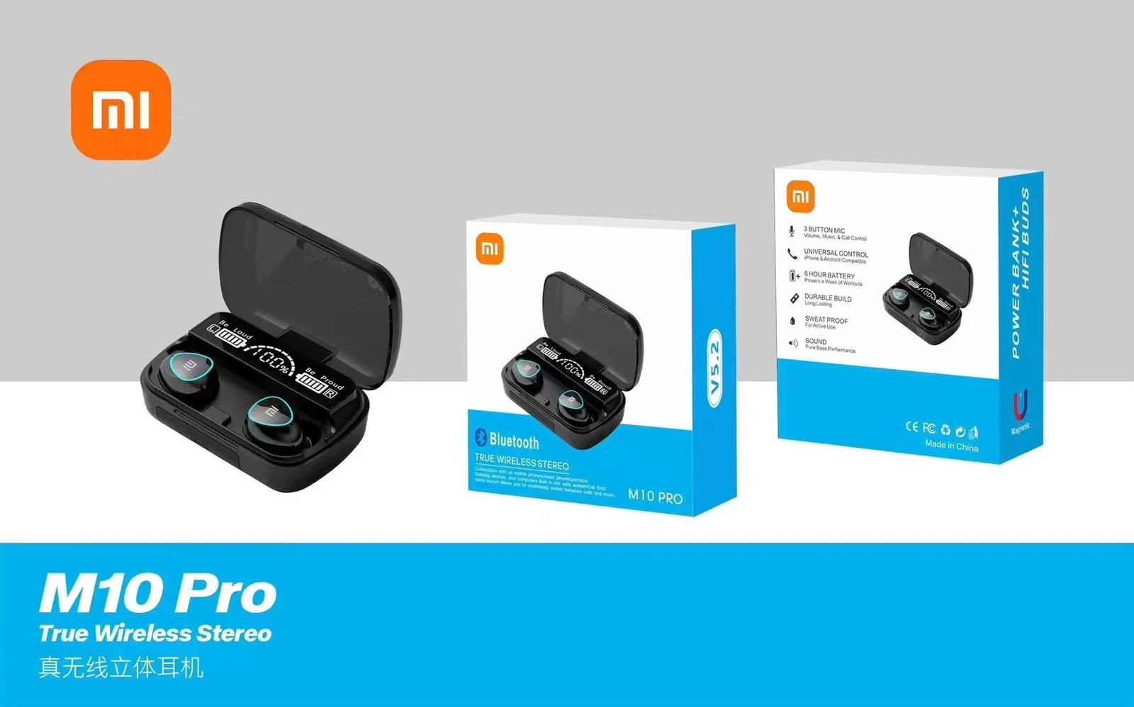 Bluetooth 5.2 + 2000mah Power bank with best Quality earbuds Product Specification:1.Model:M10pro2.Bluetooth specification:V5.23.Bluetooth Profile:A2DP AVRCP, HFP;HSP4.Working voltage:3.1V-4.2V 5.Charging voltage:SV-1A6.Battery capacity of the headset: 50MAH7.Battery capacity of the storage box:2000MAH8.Transmission distance>10M9.Call time:4-5h10.Play time:4-5h11.Waterprof IPX712.Charging time of headset:1 h13.Charging time of the Charging box:2h14.Support system:All Bluetooth devices and mobile phones;Products include1* One pair of Bluetooth headsets1* Charging box1*Charging cable1* User Manual4* Ear cap |