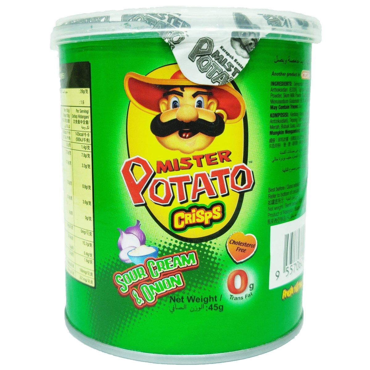 Mister Potato Crisps Sour Cream & Onion 45g: Experience the perfect blend of creaminess and zing in this convenient 45g pack. These crispy delights from Mister Potato combine the rich flavor of sour cream with the tantalizing zest of onions, making for a delicious snacking experience that's sure to satisfy.