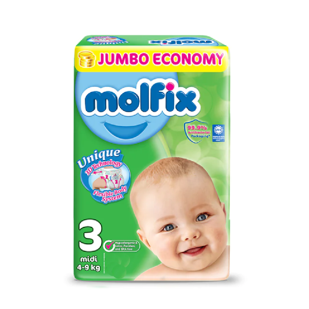 MOLFIX Diapers MIDI NO3 provide superb protection for babies between 4-9 kg. The 64 pcs pack ensures a reliable supply for even the most active little ones. The diapers are designed to draw away moisture from the babyƒ??s skin, keeping...