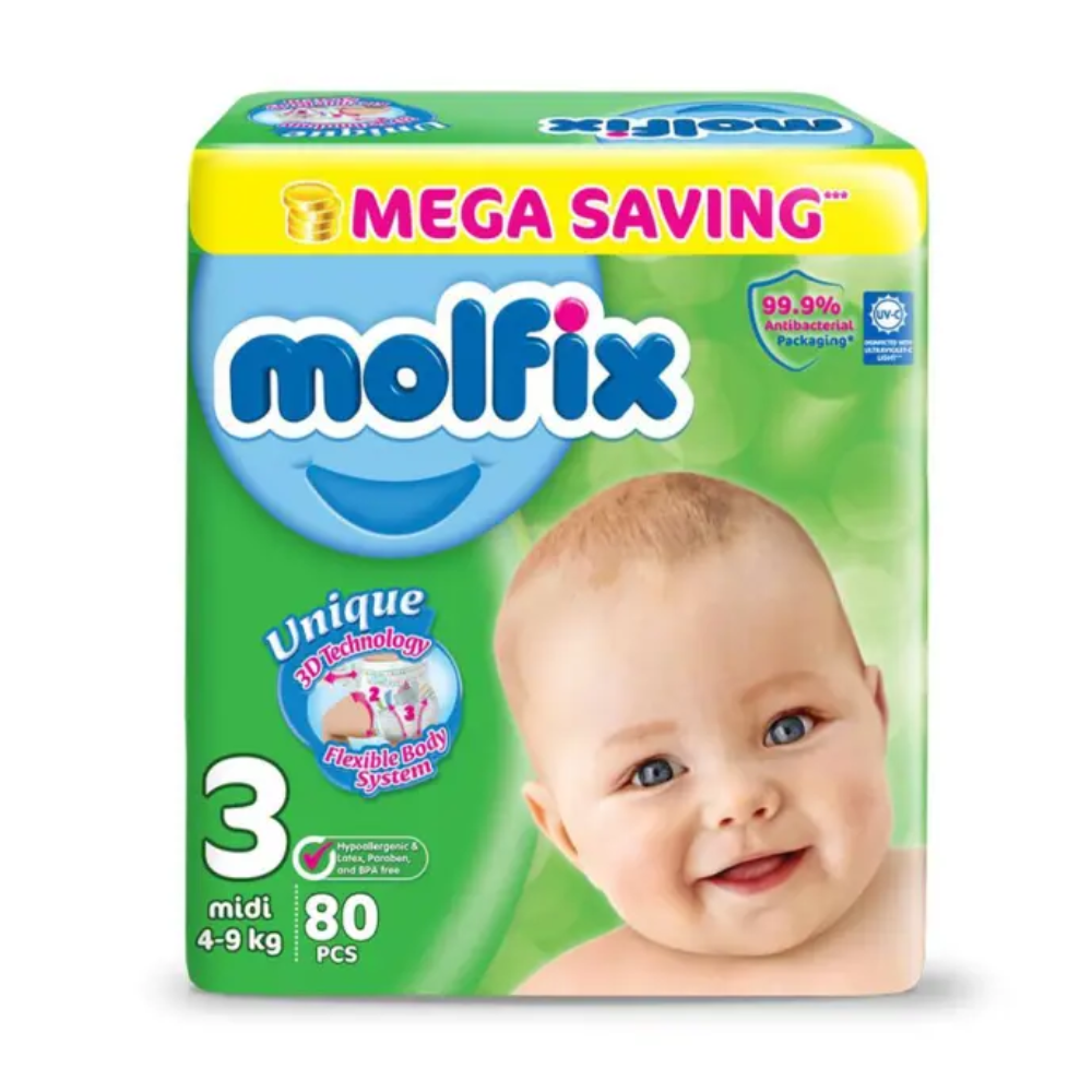 Discover great savings with the MOLFIX MEGA SAVING 3 MIDI diapers. Receive 80 pieces of diapers designed for babies between 4-9kg, with a soft breathable material that ensures your little one stays comfortable. Experience the same great protection without the...