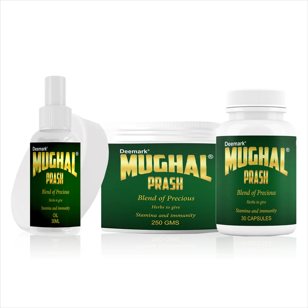 Mughal Prash is a herbal formulation of highly effective herbs to cure spermatorrhea, premature ejaculation, loss of sexual desire, erectile dysfunction etc. It helps to regain the healthy sexual functions naturally. These ingredients act on both nervous and reproductive organs. Mughal Prash is a Dietary Supplement beneficial in natural sexual enhancement. It stimulates blood flow to the Genital region. The massaging action of Oil increases the impulses to the sexual organ for initiating sexual act. The highly organized sensory end organ system in the genital parts then transmits signals to the brain & erection & arousal occurs. It works best for men who fail to get an erection from time to time, despite feeling sexually aroused and also for those who have problems with maintaining sexual desire. Properties of Deemark Mughal PrashCapsules is a boon who has poor penile rigidity due to over indulgence in sex or old age, with the growing age it continues the pleasure of sex. There could be a number of reasons for sexual problems including psychological & physical factors or a combination of both. Mughal Prash works on all factors.Indication of Deemark Mughal PrashIt is 100% Herbal and it has no Side effects. Ingrediants of Deemark Mughal Prash