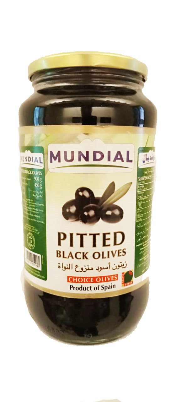 Mundial Pitted Black Olives, packed in a 900g jar, provide you with the convenience of ready-to-use olives. These olives have a rich and intense flavor, making them a versatile ingredient in your dishes.