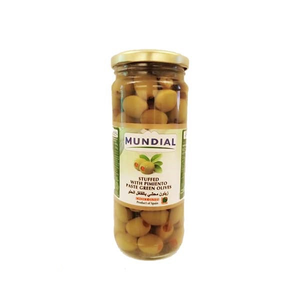 Mundial Stuffed Green Olives are a gourmet delight. This 450g jar contains plump green olives stuffed with various savory fillings, making them a delightful addition to your appetizers and charcuterie boards.