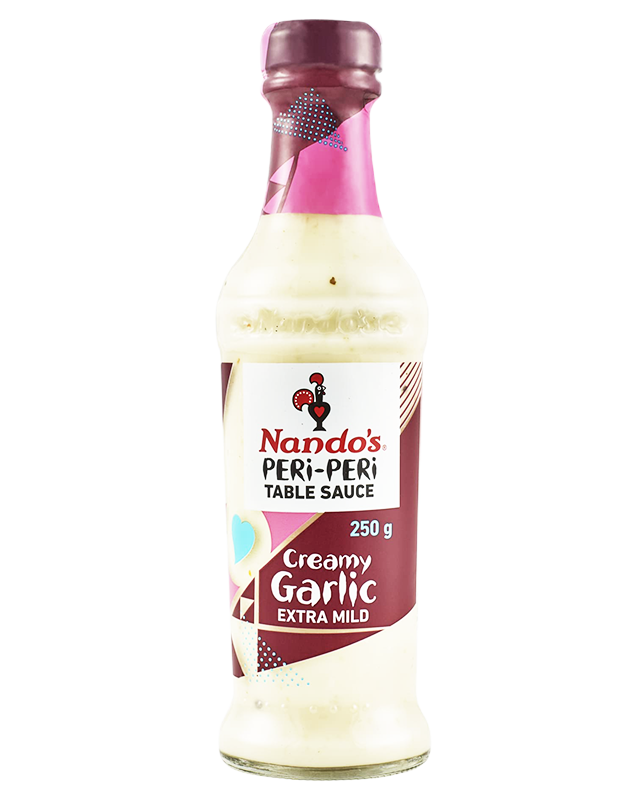 Nando's Peri Peri Sauce Creamy Garlic Extra Mild 250g Nando's Peri Peri Sauce Creamy Garlic Extra Mild, sized at 250g, offers a creamy and mild variation of the beloved Peri Peri sauce. Infused with garlic flavor, this sauce adds a delightful creaminess and a hint of spice to your meals.