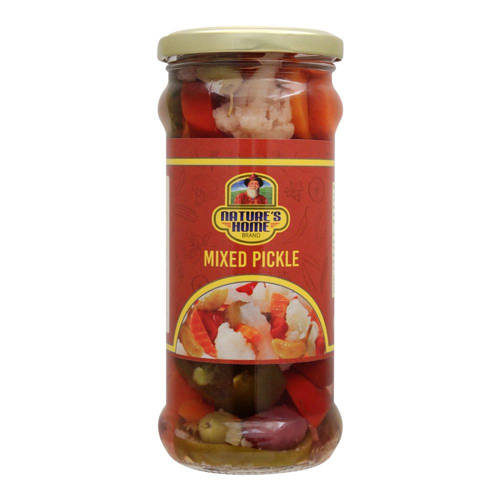 Nature's Home Mixed Pickle is a blend of pickled vegetables in a 370g jar, offering a medley of flavors and textures that are perfect for adding a zesty kick to your meals.
