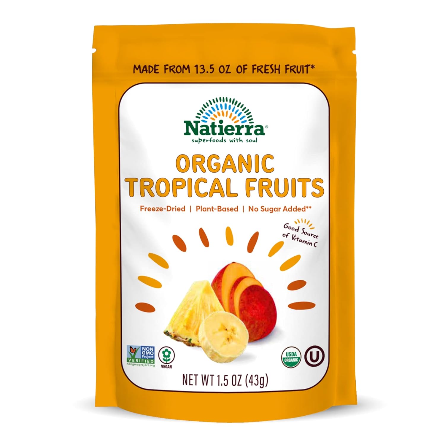 Natures All Organic Tropical Fruits Bag is a selection of organic dried tropical fruits, offering a mix of flavors and textures. This 34g bag includes a variety of fruits such as mangoes, pineapples, and papayas, making it a convenient and healthy snack option.
