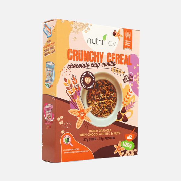 Nutrilov Crunchy Cereal with Chocolate Chip and Vanilla is a 420g pack of wholesome cereal with a delicious blend of chocolate chips and vanilla flavor.