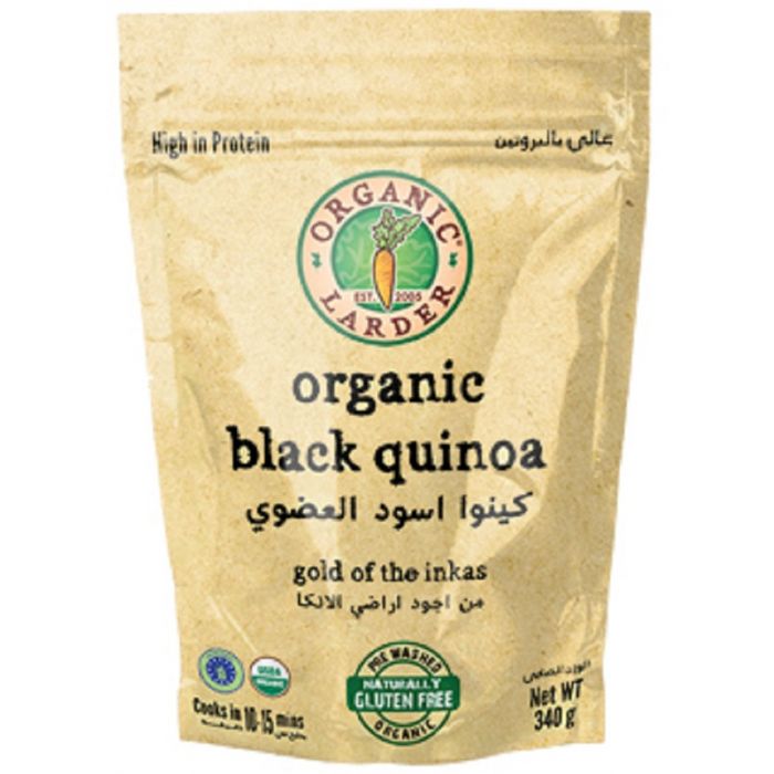 Organic Larder Organic Black Quinoa is premium black quinoa that is certified organic, meaning it is grown without the use of synthetic pesticides, herbicides, or genetically modified organisms (GMOs). Quinoa is a gluten-free whole grain that has gained popularity for its nutritional value and versatility in cooking.