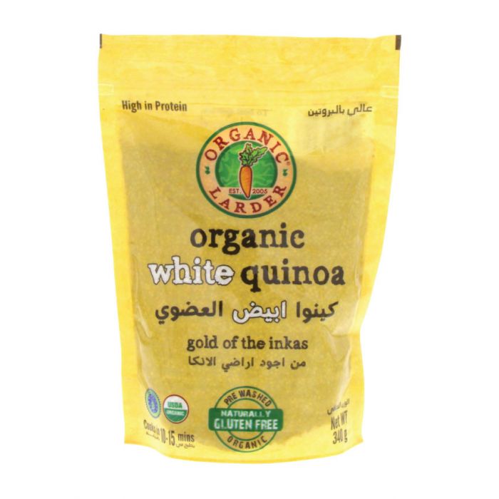 Organic Larder Organic White Quinoa is premium white quinoa that is certified organic, meaning it is grown without the use of synthetic pesticides, herbicides, or genetically modified organisms (GMOs). Quinoa is a gluten-free whole grain that has gained popularity for its nutritional value and versatility in cooking.