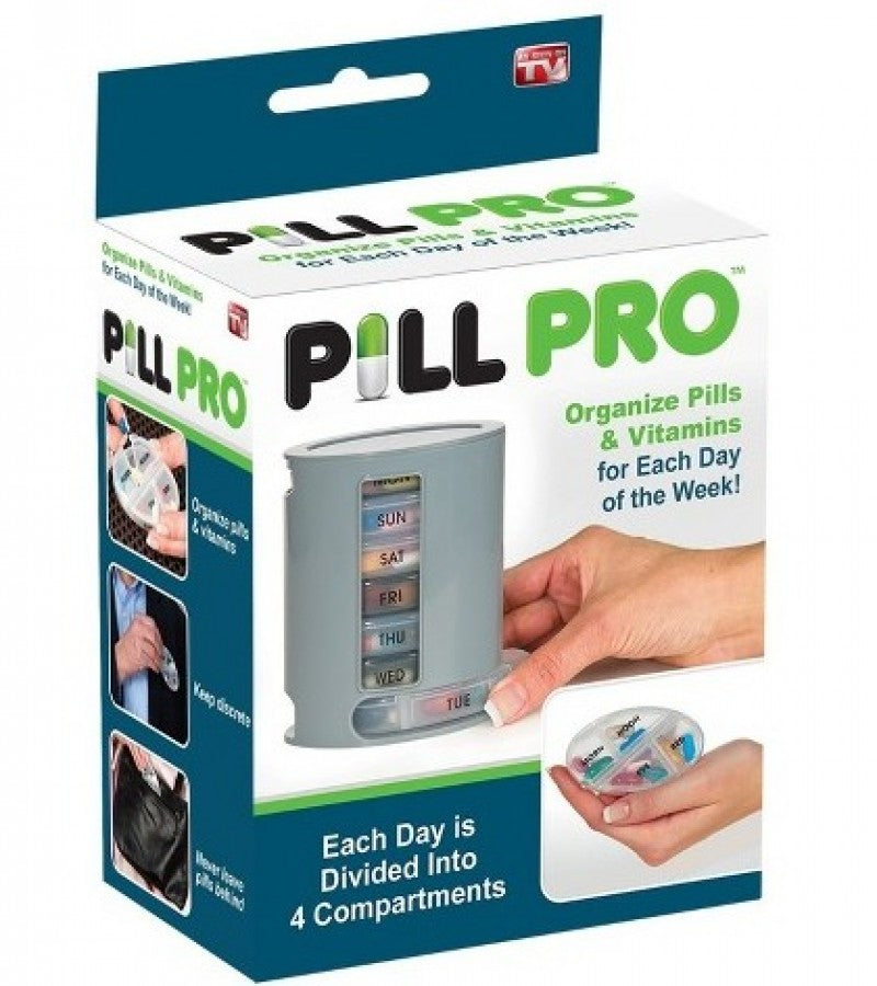 Pill Pro lets you conveniently organize your medicine and vitamins for each day of the week. Inside the As seen on TV Pill Pro are 7 portable trays, one for every day of the week. Plus, each day of the week is clearly marked and has four compartments for separating pills or organizing them by time of day. When you pull the day's tray out of the bottom of the Pill Pro, the next tray slides down into place. Simply refill Pill Pro by removing the top.