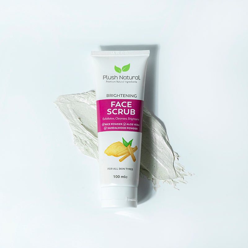Plush Natural Brightening Face Scrub, in a 100ml tube, is a gentle exfoliating scrub that helps remove dead skin cells, revealing a brighter and smoother complexion.