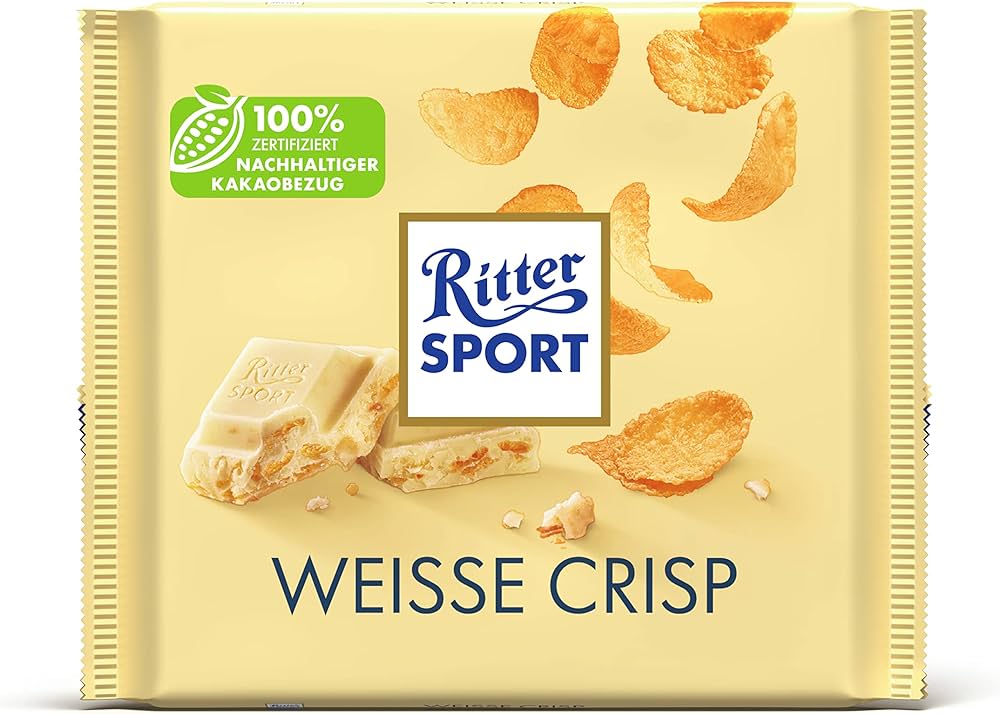 Ritter Sport Chocolate Weisse Crisp Tafel Bar is a 250g bar of white chocolate with crispy inclusions, providing a delightful texture and sweetness.
