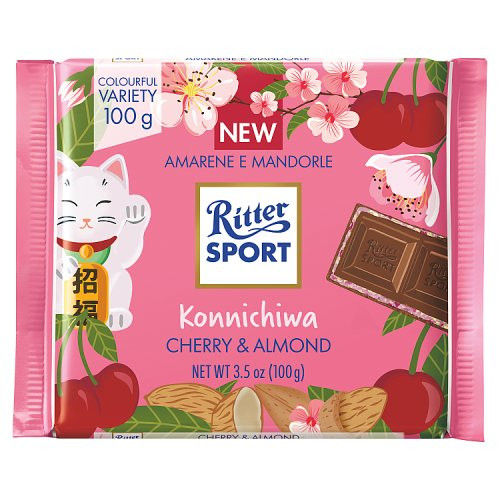Ritter Sport Konnichiwa Cherry & Almond is a 100g square bar of Ritter Sport chocolate that combines the flavors of cherry and almond for a deliciously nutty and fruity combination.