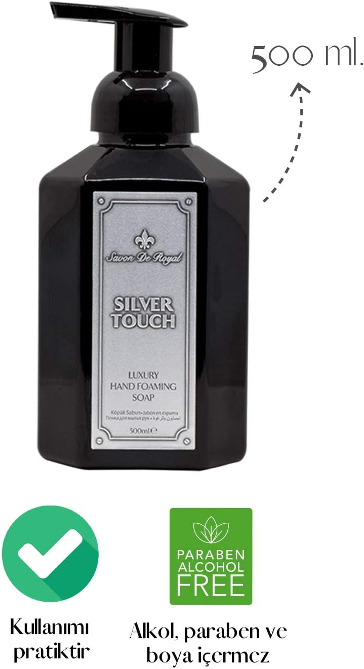 The Savon De Royal Luxury Hand Foaming Soap - Silver Touch, a pinnacle of opulence and refinement. Crafted with utmost care, this exquisite hand soap offers a truly indulgent experience. Its luxurious formula, enriched with premium ingredients, gently cleanses and nourishes the skin, leaving it feeling soft, supple, and rejuvenated. The Silver Touch variant adds a touch of elegance with its captivating fragrance, evoking a sense of sophistication. The scent is carefully crafted to provide a sensory experience that lingers on the skin, leaving a subtle and alluring aroma. Elevate your handwashing routine with this prestigious product, designed to provide a lavish and pleasurable moment of self-care. The foaming texture creates a rich and velvety lather that envelops your hands, ensuring a thorough and enjoyable cleansing experience. The Savon De Royal Luxury Hand Foaming Soap - Silver Touch is more than just a soap; it is a symbol of luxury and refinement. The sleek and elegant packaging adds a touch of sophistication to any bathroom or kitchen, making it a statement piece that reflects your impeccable taste. Indulge yourself in the epitome of luxury with Savon De Royal Luxury Hand Foaming Soap - Silver Touch. Experience the pleasure of using a product that not only cleanses your hands but also pampers and nourishes your skin. Treat yourself to a moment of pure indulgence and elevate your handwashing routine to new heights of luxury.