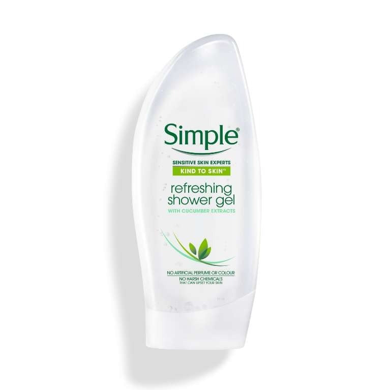 Simple Kind to Skin Refreshing Shower Gel is the perfect blend of ingredients to clean and energise your skin.Simple's sensitive skin experts created a shower gel that is perfect for even the most sensitive skin.Simple Refreshing Shower Gel is enriched with cucumber extracts and pro-vitamin B5.This body wash contains no artificial perfume, colour, or harsh chemicals that can upset your skin.This shower gel for dry skin is dermatologically tested and approved.Squeeze our sensitive body wash onto a sponge or your hands.Gently massage over your skin to form a rich lather. Rinse thoroughly. Avoid contact with eyes.