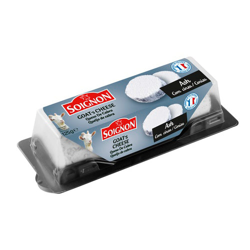 Soignon Goat Cheese with Ash is a premium cheese product that offers the creamy and tangy taste of goat cheese along with the intriguing addition of edible vegetable ash. This ash not only enhances the visual appeal of the cheese but also contributes a subtle earthy flavor.